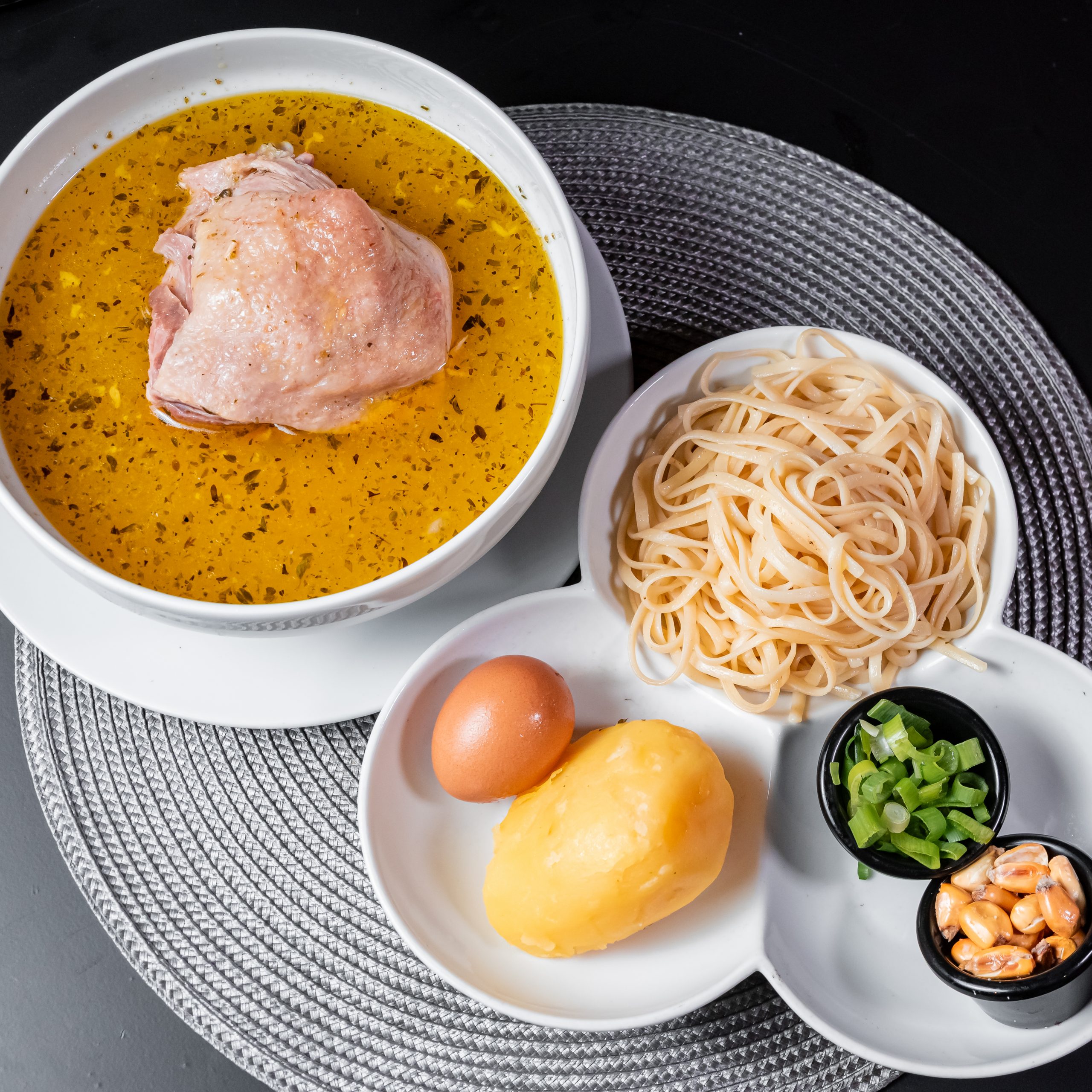 Caldo casero de gallina, cocido lento hasta soltar todo el sabor, servida con papa amarilla, tallarines, huevo duro y cebolla china. (VIERNES. SABADO Y DOMINGOS)